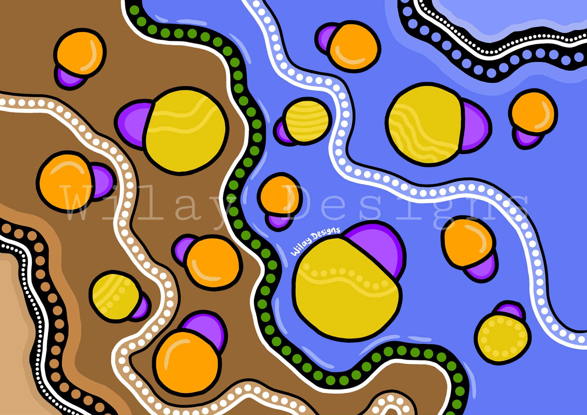 This artwork of the Balad - a native cherry tree which survives by drawing water from its host. The blue represents water, with surrounding Country colours showing where the Balad grows. Everything on Country is connected!
