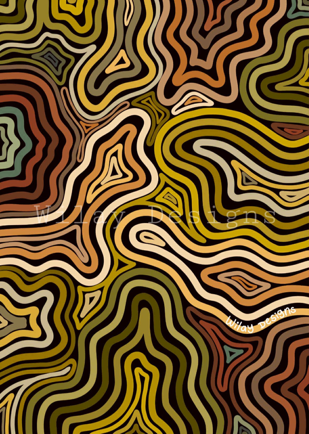 This artwork is inspired by time spent along the Yass River- a place of deep connection, quiet reflection and shared stories. The flowing colours represent the movement of water and the way culture travels with it.
