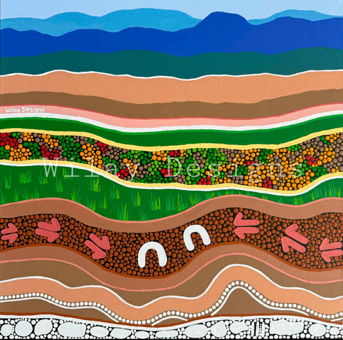 This artwork is inspired by the Theodore Grinding Grooves site- an important place of cultural significance for us Ngunawal Peoples. The layers reflect the landscape and the stories it holds- from the distant blue ranges and grassy hills, to the vibrant bushland and marks left by generations of crafting tools. Here I imagine my old people gathered- sharing stories, surviving together and being connected to Country. That’s the feeling I want to honour through this piece. It shows respect to sacred places, the tools shaped with care and the cultural importance they continue to have.